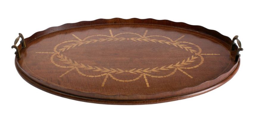 An Edwardian mahogany and inlaid gallery tray of oval outline with inlaid foliate garland decoration, with brass carrying handles to the sides, 68cm wide.