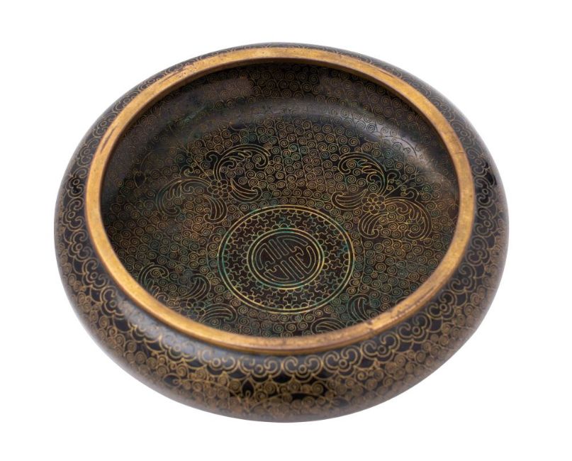 A Chinese cloisonne bowl centred with the emblem for longevity with coiled scale decoration to a black ground, bears four character seal mark to the base, late Qing period, 20.5cm diameter.