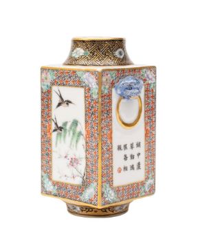 THE COLLECTION OF THE LATE E.J. WHYTE (1931-2022)After working in the fire service for 10 years, 'Jack' Whyte joined Brian Bearne at his Warren Road, Torquay auction rooms in the mid 1960s as saleroom manager. However he always had a particular interest in antique pottery and porcelain and he soon became Bearnes' ceramic specialist and cataloguer. Jack carried on heading the department during the years at Rainbow, Torquay and after the company moved to Exeter worked as a part time consultant until 2019. He used his extensive knowledge and skill to good effect when acquiring pieces for his own collection from the many antique shops and markets in and around Torbay, particularly in the 1970s and 80s. He will be remembered by dealers and collectors for his expertise and helpfulness but his many friends and past colleagues will never forget his infectious enthusiasm and wonderful dry sense of humour.Studio ceramics from the collection will be offered in our 20th Century & Contemporary Sale on 28th February.A Chinese famille rose Cong vase of small size, with buddhist lion dog ring handles, finely painted on two sides with geese, swallows and flowering plants, the opposing sides with black poetic inscriptions on an iron-red and grisaille flowerhead and diaper ground, the concave shaped rim and foot decorated with a black key pattern and peony scrolls on a gilt ground, iron-red four-character mark for the 'hall for the Cultivation of Virtue', Republic/20th century, 13cm [minor wear to gilt rim].* The inscriptions can be translated to read 'Purple blossoms and green willow billowing in the fragrant air/Geese befriending amongst reeds in the pond'.