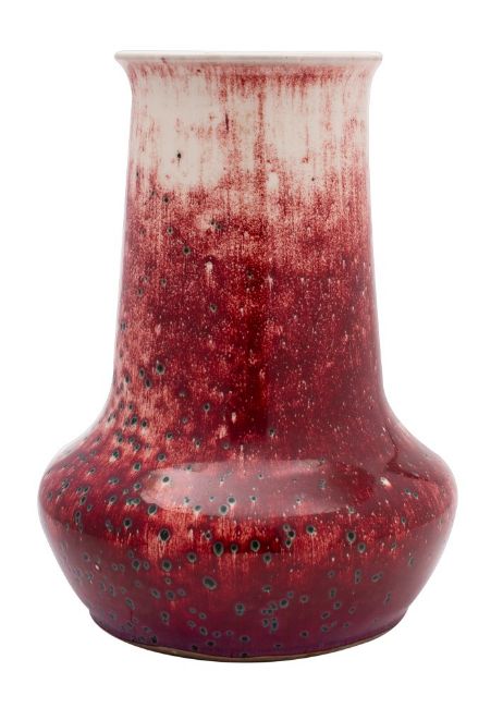 A large Ruskin high-fired vase with tapering neck and flared rim, covered in a flambé, ivory and green speckled glaze, black painted mark 'Ruskin England', early 1930s, 32cm.