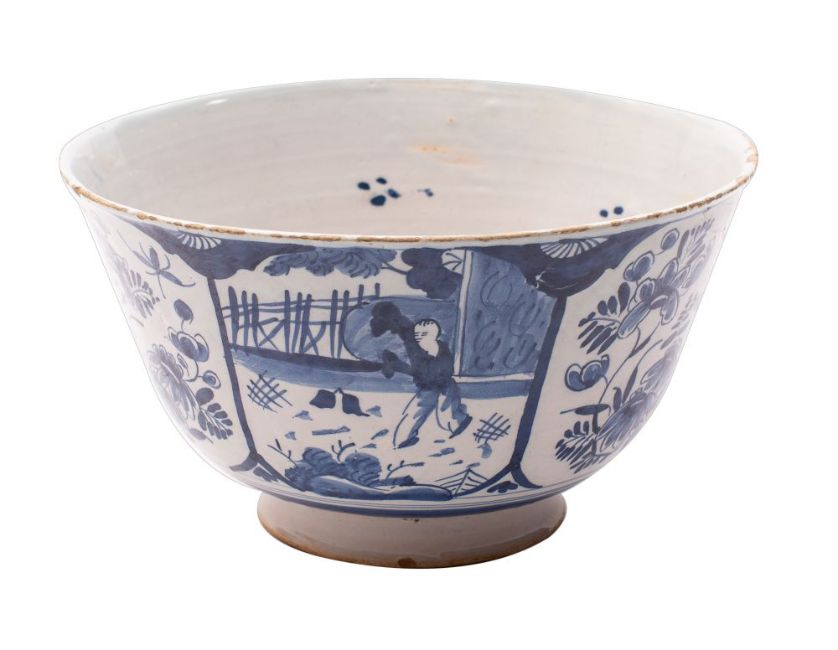 An English blue and white delftware chinoiserie punch bowl of straight sided tapering form with tall footrim, painted with alternating panels of a dancing chinaman in a garden and floral sprays with a flying moth, numeral 3 mark, possibly London, circa 1730-50, 27cm diameter [minor chips/glaze losses].