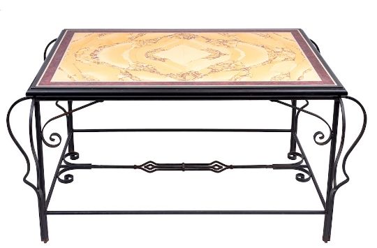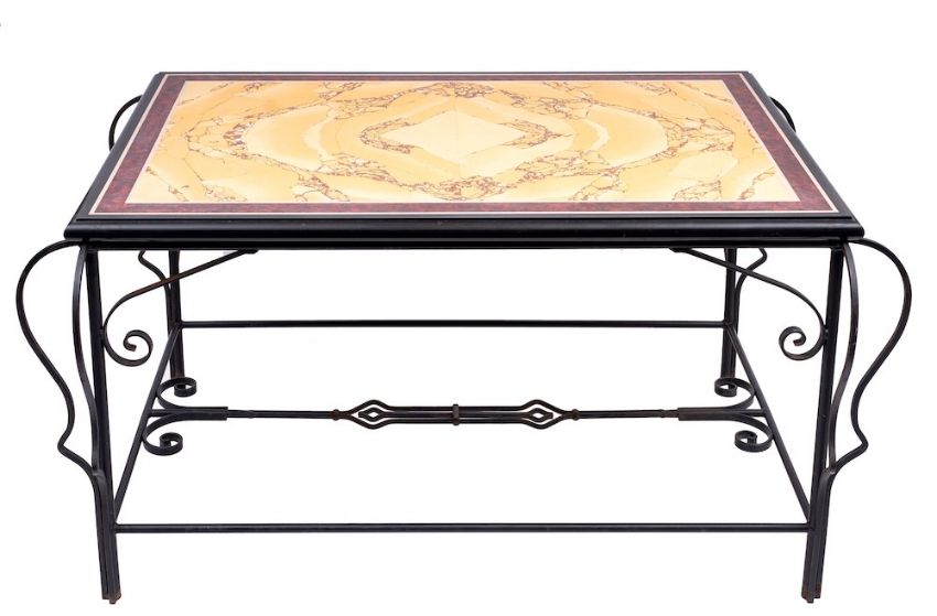 A scagliola and wrought iron mounted conservatory table, modern,: the rectangular top with faux Siena marble central field within a faux rouge griotte border, in a polished black stone matrix; the black painted base frame with openwork scrolling supports and stretcher; 85cm high, the top 150 x 100cm, the overall length, 172cm, width 122cm.Please note: This table was created by the craftsmen responsible for the green Scagliola Ionic columns in the Stair Hall of the Queen's Gallery at Buckingham Palace, designed by John Simpson Architects and opened in 2002 to mark the Golden Jubilee. The table also has a toughened glass top with polished edges.