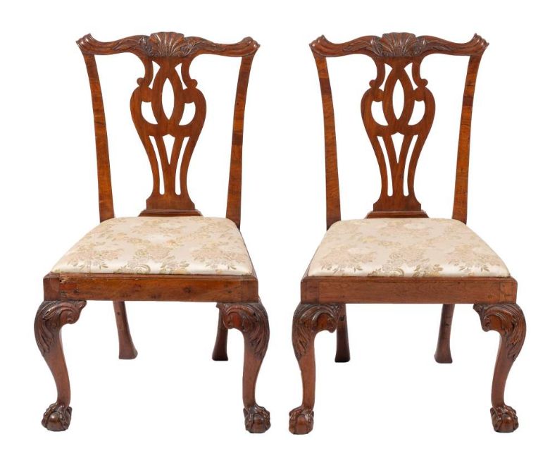 A pair of George II walnut side chairs, mid 18th century,: the serpentine toprails carved with central scallopshells, above pierced vase form splats; the drop in upholstered seats in moulded rails; with cabriole front legs descending from acanthus carved knees to ball-and-claw feet; 97cm high, 61cm wide