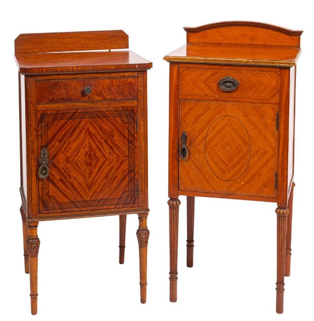 Two similar mahogany and line inlaid bedside cupboards in Louis XVI taste, circa 1900; one with shallow arched back gallery, above a drawer and a quarter veneered door; on lobed, reeded and knopped legs; the other with canted rectangular gallery and foliate carved legs; 88cm high, 42cm wide and 84cm high, 41cm wide respectively