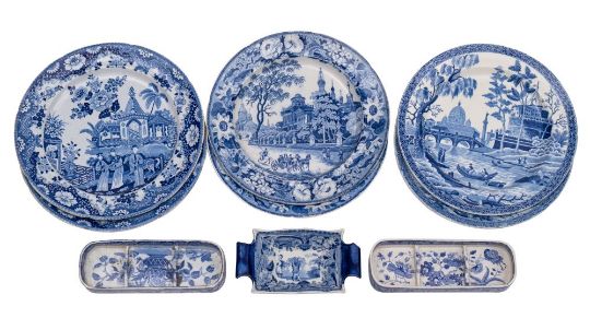 A mixed lot of early 19th century Spode and other blue and white transfer printed pottery including a pair of plates in the Rome [Tiber] pattern, 25cm; two pairs of similar plates with topographical and chinoiserie scenes, 25 and 26cm; two pen trays, 19cm; and a shaped rectangular dish,16cm [some chips] 9.