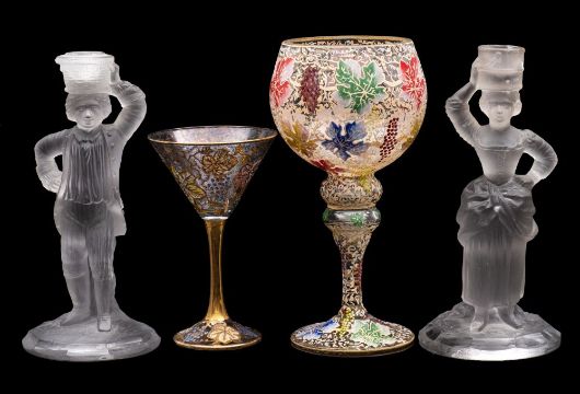 Two enamelled wine glasses together with a pair of frosted figural candlesticks, tallest glass 25cm. [4]