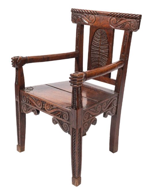 A carved oak elbow chair in 17th century taste, second half 19th century; the scroll carved toprail with ropetwist upper edge, above a rectangular splat with stylised tree motif carved in recessed relief in an oval reserve, the sides with recessed wheat ear carving; the armrests as sleeved human arms terminating in clenched fists; the plank seat above conforming scroll carved rails; on straight legs; 91cm high, 62cm wide