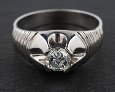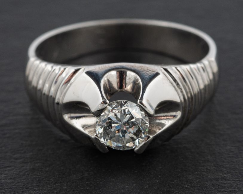 A round, brilliant-cut diamond, single-stone ring, estimated diamond weight ca. 0.75ct, I-J colour, SI2-P1 clarity, stamped 750, length of ring head ca. 1.5cm, ring size V, total weight ca. 9.8gms.