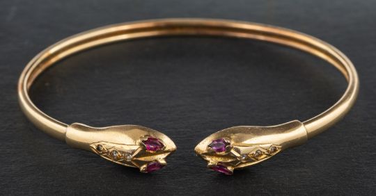 A ruby and white paste, double-headed snake bangle, stamped '585', inner diameter ca. 6.2cm, total weight ca. 8.6gms.