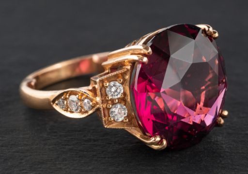An 18ct gold, round, faceted rhodolite garnet and round, brilliant-cut diamond ring, estimated garnet weight ca. 11cts, estimated diamond weight ca. 0.20ct, with hallmarks for London, 2017, length of ring head ca. 1.8cm, ring size H1/2, total weight ca. 7.1gms.