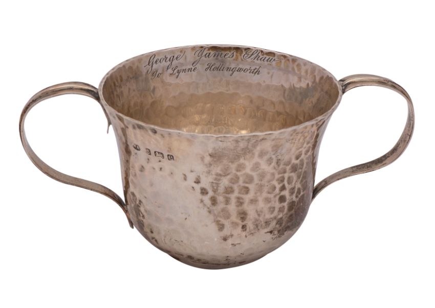 An Edward VII silver twin-handled cup, maker William Aitken, Birmingham 1904 with a hammered finish and inscription, 9.5cm diameter, 150gms, 4.8ozs.