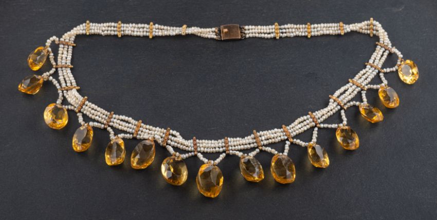 A late 19th/ early 20th century, four-row, seed pearl, choker necklace, with graduated oval, mixed-cut citrine pendants suspended from engraved floral spacers, lengths of citrines ca. 1.3-1.7cm, length of necklace ca. 38cm.