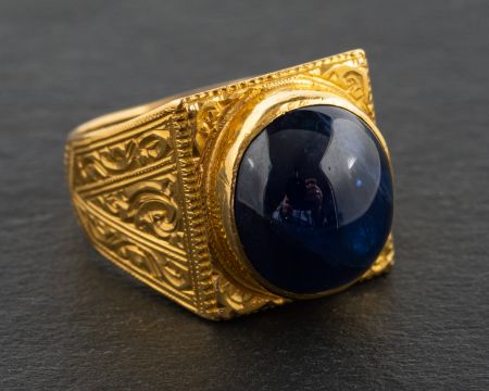 A cabochon-cut sapphire ring, estimated sapphire weight ca. 7cts, length of ring head ca. 1.3cm, ring size I, total weight ca. 8.1gms.