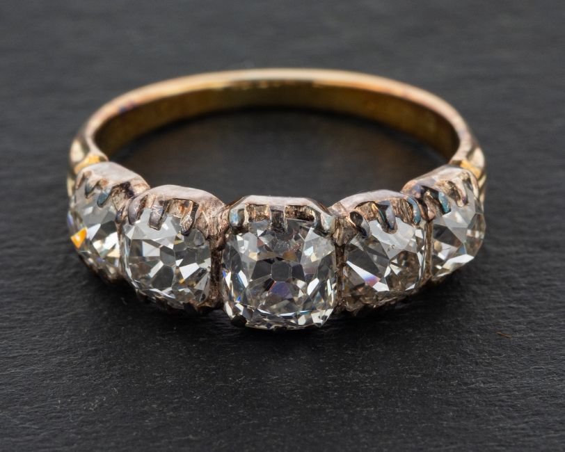 A cushion-cut diamond, five-stone ring, total estimated diamond weight ca. 3.05cts, G-I colour, VS1-SI1 clarity, length of ring head ca. 1.8cm, ring size N, total weight ca. 3gms, accompanied by fitted case.