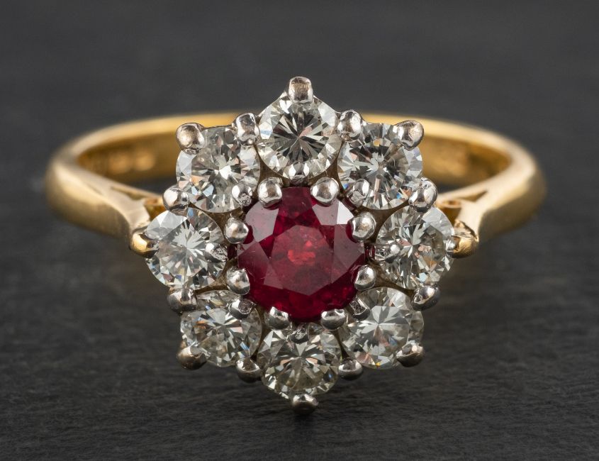 An 18ct gold, round, mixed-cut ruby and round, brilliant-cut diamond cluster ring, estimated ruby weight ca. 0.60ct, total estimated diamond weight ca. 0.80ct, H-I colour, SI1-2 clarity, length of ring head ca. 1.2cm, ring size M, total weight ca. 4.8gms.