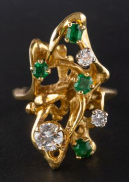 A 1960's round, brilliant-cut diamond and emerald dress ring, total estimated diamond weight ca. 0.75cts, G-H colour, VS1-2 clarity, length of ring head ca. 3cm, ring size M, total weight ca. 14gms.