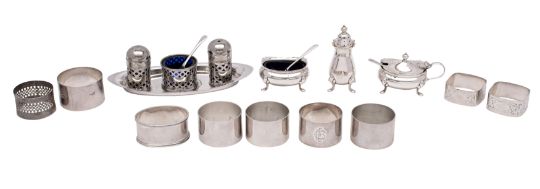 A mixed collection of silver items to include;- an Elizabeth II silver three-piece cruet set and two spoons, makers Adie Bros. Ltd, Birmingham 1962, each piece on four feet, seven silver napkin rings (various designs, makers and dates), two plated napkin rings and a plated cruet, silver weight 311gms, 10ozs.
