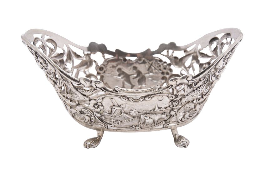 A Continental silver bon bon dish, stamped marks of oval form, 12cm wide, the centre decorated with a tavern exterior with figures drinking, with pierced foliate sides, raised on four paw feet, 98gms, 3.16ozs