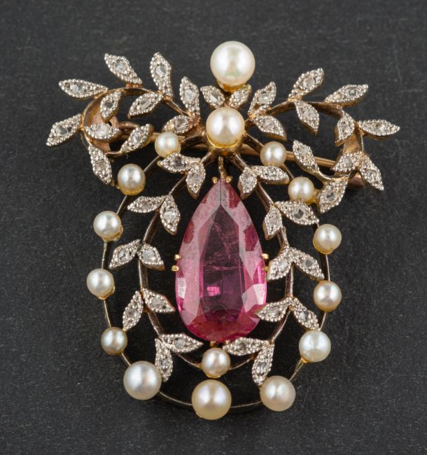 A Garland-style, pear-shaped, mixed-cut pink tourmaline, rose-cut diamond, seed and probably cultured pearl, openwork pendant/ brooch, estimated tourmaline weight ca. 2.65cts, total length ca. 3.2cm, total weight ca. 6.1gms.
