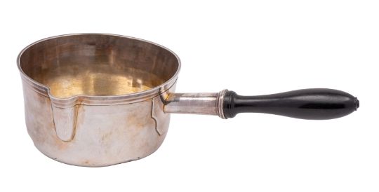 A late 18th/Early 19th Century French silver circular saucepan with single lipped bowl and turned wood handle, 13.5cm diameter, 327gms, 10.5ozs gross weight.