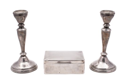 A pair of Elizabeth II silver candlesticks, Birmingham 1959 the integral sconces with Celtic borders, on tapered columns and circular bases, Birmingham 1959, 20.5cm high, the bases weighted, also an Elizabeth II silver cigarette casket, makers Padgett & Braham Ltd, London 1964, of plain rectangular shape, wood lined, 13.5cm x 9cm.5