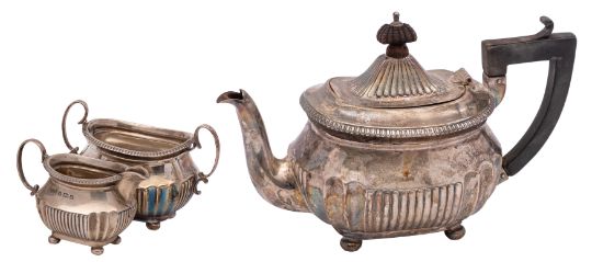 A George V Bachelor's Silver three piece tea service, maker Alexander Clark and Co Ltd, Birmingham, 1912: of barge-shape outline, with half reeded and fluted decoration, on four bun-shaped feet, comprising a teapot with ebonised knop and handle, a twin-handled sugar basin and a cream jug, 528gms, 16.9ozs