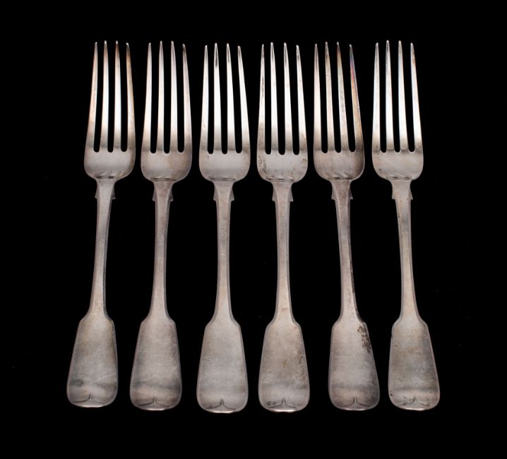 A set of six William IV silver fiddle pattern table forks, maker James Beebe, London 1836, 439gms,14.1ozs.