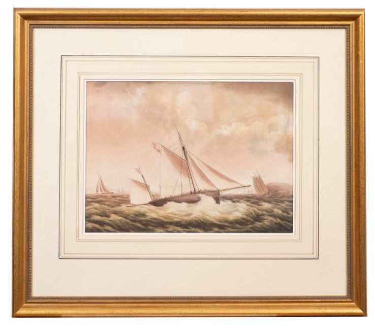 British School early 19th CenturyRoyal Navy three-masters and other shipping off the coast,two, watercolours, largest 16.5 x 22cm,together with one other contemporary yachting watercolour by a different hand. [3]