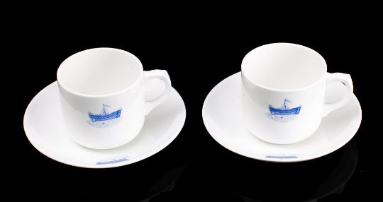 A pair of Royal Navy Hospital HMS Dreadnought coffee cups and saucers by Adderley: with blue glaze transfer decoration.