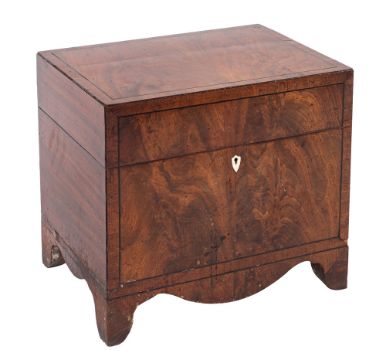 A George IV mahogany box decanter, of rectangular form, decorated with ebony stringing, the hinge lid opens to reveal a fitted interiors, with six small gilded glass and five large decanter bottles, raised on bracket feet, 38 high, 42cm wide, 30cm deep