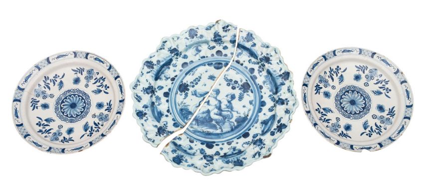A large Savona blue and white maiolica moulded dish and a pair of Dutch blue and white delftware dishes the first painted with child fauns seated amongst rockwork, the rim with buildings and scattered foliage, lighthouse mark, late 17th/early 18th century, 45cm [broken across]; the Dutch dishes painted with a central flowerhead and sprays, mid 18th century, 31cm [damage to both] 3.