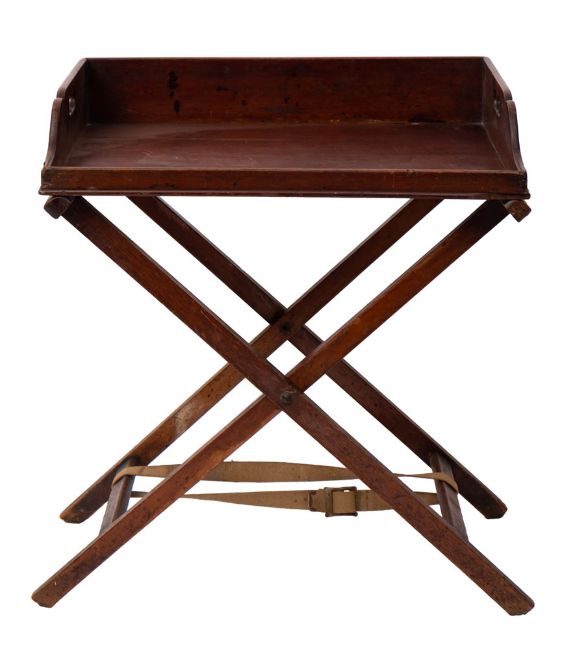 A George III mahogany butler's tray on stand, circa 1780; the three quarter gallery sides pierced at each end for a handle; with folding 'X' frame stand; the tray 11cm high, 68cm wide, 55cm deep