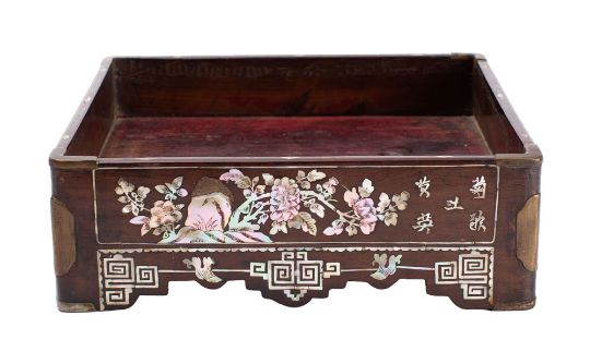 A Vietnamese mother-of-pearl inlaid hardwood tray inlaid with flowering stems, rockwork and key patterns, metal banded corners and on bracket feet, circa 1900, 25cm.