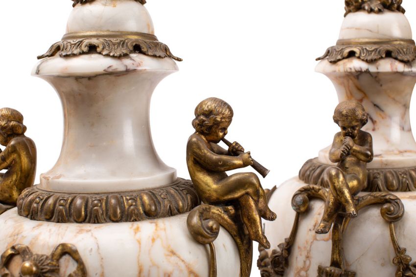 A pair of Continental ochre veined Carrara marble and gilt metal mounted urns in Neoclassical style, circa 1900; of ovoid form, each with two seated musical putti beneath the slender, waisted neck; with floral festoons hung from bow tied ribbons; the socles with imbricated laurel cast collars and square marbre breche violette bases, on toupie feet; 59cm high