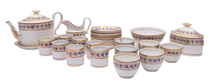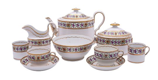 A Spode porcelain tea set, comprising an oval teapot cover and stand, milk jug, sucrier and cover, waste bowl, six cups, seven cans and twelve saucers, enamelled and gilt with a band of flowers, pattern no. 330, circa 1805-10, [slight damage].