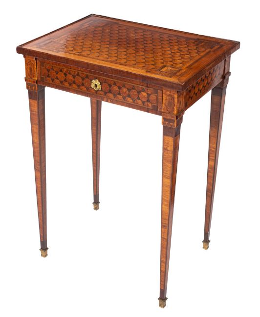 A 19th Century French kingwood, tulipwood, satinwood and parquetry table à écrire of rectangular shape, crossbanded and bordered with lines, the top and sides with stellar parquetry panels, the frieze drawer with a tooled leather inset sliding writing panel and divided compartment below, on square tapered legs, headed with paterae, terminating in brass spade feet, 54cm (1ft 9ins) wide, 40cm (1ft 3 3/4ins) deep, 73cm (2ft 4 3/4ins) high.