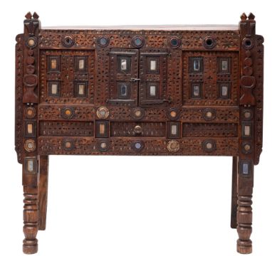 A Chinese stained hardwood and metal mounted 'Damachiya' dowry chest, in antique taste, modern; the doors and front panels inset with mirrored glass within repousse worked mounts; on through stiles descending from carved horses' heads finials; 108cm high, 110cm wide, 45cm deep