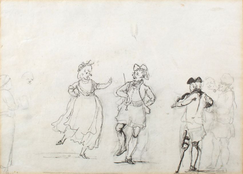 Circle of Thomas Rowlandson (British, 1759-1827)Sir Jacob Jallop and Major Strugeon in an interior setting, from Samuel Foote's the Mayor of Garratt; a rustic dance with musicians (reverse of sheet)indistinctly initialled and dated '96 lower left, and one side inscribed with the character names and title of the playchalk, ink and wash drawings on paper27 x 37 cmA similar composition with the two characters from Foote's popular circa 1763-4 play The Mayor of Garratt, was also rendered by Johann Joseph Zoffany, and circulated in a contemporaneous engraving by J. F. Haid.