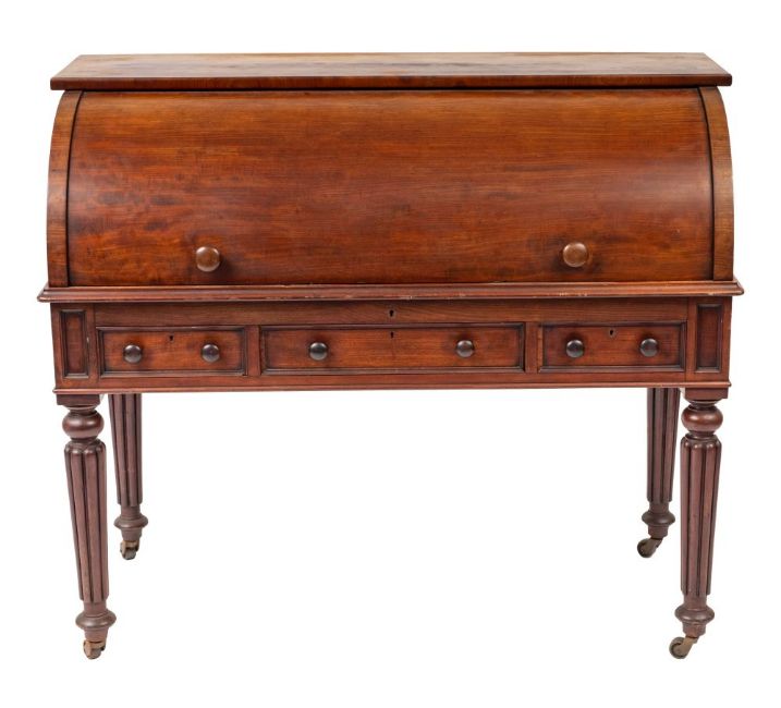 A Regency mahogany cylinder bureau, early 19th century; with rectangular top above the roll front, with twin knob handles; opening to a fitted interior of pigeonholes and drawers, above a hinged writing surface with inset gilt tooled leather skiver; above three drawers; on lobed and tapering legs to metal castors; 102cm high, 119cm wide, 60cm deep