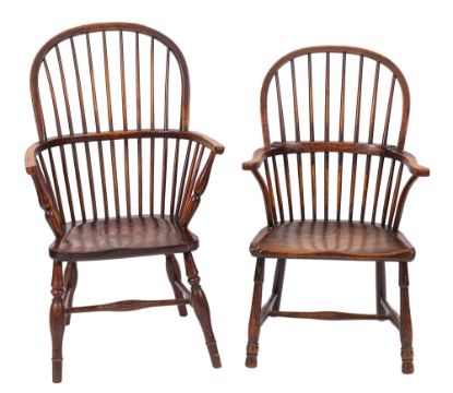 A 19th Century elm, ash and beech stick back Windsor elbow chair having outswept arm supports and shaped solid seat on truncheon legs, united by H-stretcher, together with another Windsor stick back elbow chair (2)