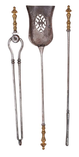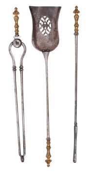 A set of three steel and brass mounted fire irons in George III style, 19th century; comprising shovel poker and tongs, with wasted and foliate cast grips, the pierced shovel of tulip form; 74cm long