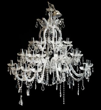 A contemporary cut glass three tier graduated twelve branch chandelier, hung with pear-shaped drops and faceted swags, the clear plastic covered branches with prunted decoration, having glass flowerhead and silvered candle sconces, approximately 98cm across, 92cm drop.