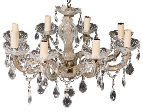 A moulded glass and metal mounted eight light chandelier, 20th century; the electrical fitments in dished drip pans, on serpentine branches issuing from a hobnail moulded inverted baluster stem, hung overall with faceted glass bead swags and pendants; 35cm high, 53cm wide