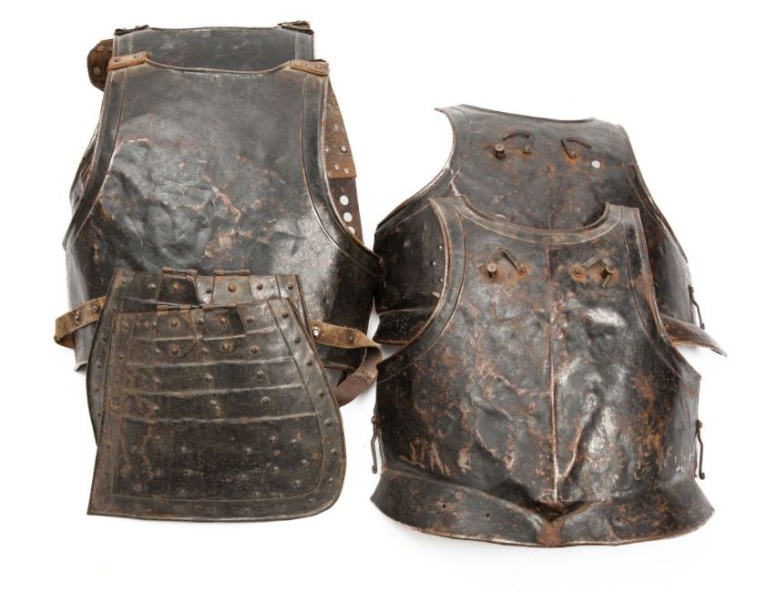 Two part sets of Reproduction English Civil War Pikeman's armour, together with a Delft tile with Pikeman decoration.