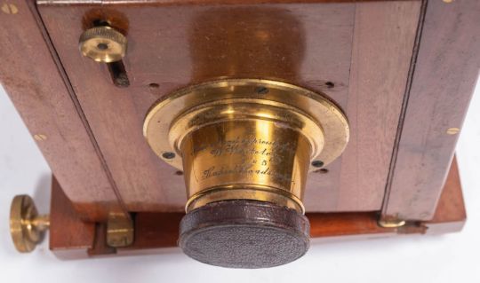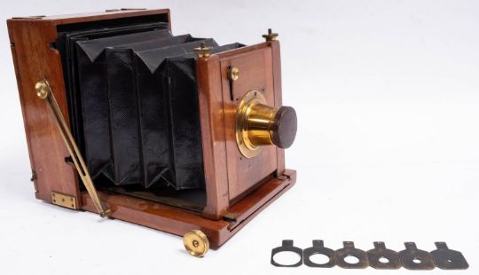 A Perkin Son & Rayment mahogany and brass half plate field camera, fitted lens engraved 'Made Abroad expressly for A Whiteley. 7x5 Rapid. London' with six brass stops F8 to F64. standard rise and fall and horizontal shift front with black bellows, 21x20cm