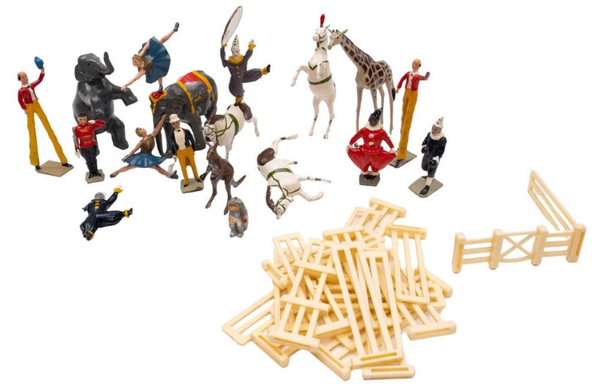 Britains Circus, a collection of painted lead figures and animals from the series including 2 stilt walers