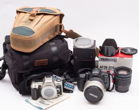 Minolta 35mm SLR camera group: comprising a Dynax 500si serial number 00704768 fitted Sigma 28-300mm f1:3.5-6.3 lens, a Dynax 505si body serial number 01001214 and a Tamron AF 28=300mm f1:3.8-5.6 aspherical lens in original box.