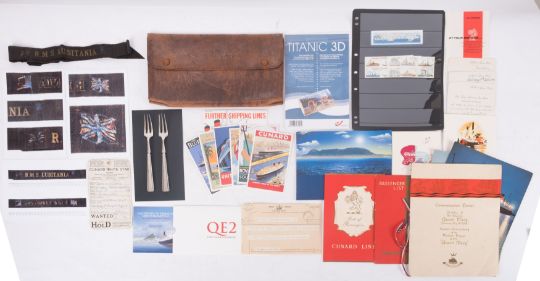 Maritime lot with Cunard interest, Lusitania cap tallies, cutlery.