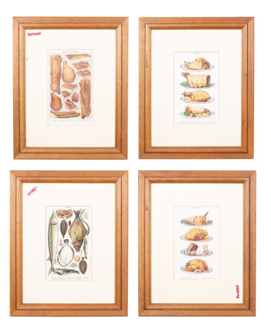 A set of four coloured prints, entitled 'Poultry', 'Bacon and Ham', 'Fish' and 'Joints', each framed and glazed.
