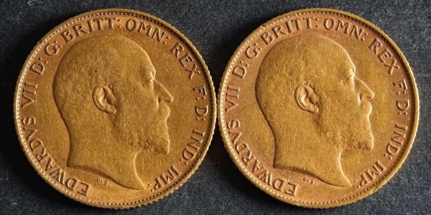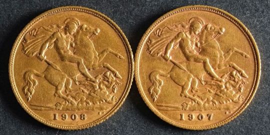 Two Edwardian Half Sovereigns dated 1907 and 1908.